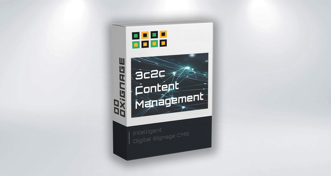 3c2c als Cloud-basierendes Content-Management-System ermöglicht eine einfache und schnelle Bearbeitung der Playlisten und einzelnen Displays direkt in jedem Browser. Unterstützt wird auch das Verwalten über mobile Geräte. Der Funktionsstatus der Player lässt sich mit dem Monitoring-Tool in Echtzeit überprüfen.Digitale Medien und interaktive Anwendungen (Content) können als Playliste mittels des 3c2c-Administrationstools zusammengestellt, verteilt und auf unterschiedlichen Playern mit unterschiedlichen Betriebssystemen in einem solchen Netzwerk zeitgesteuert dargestellt werden.