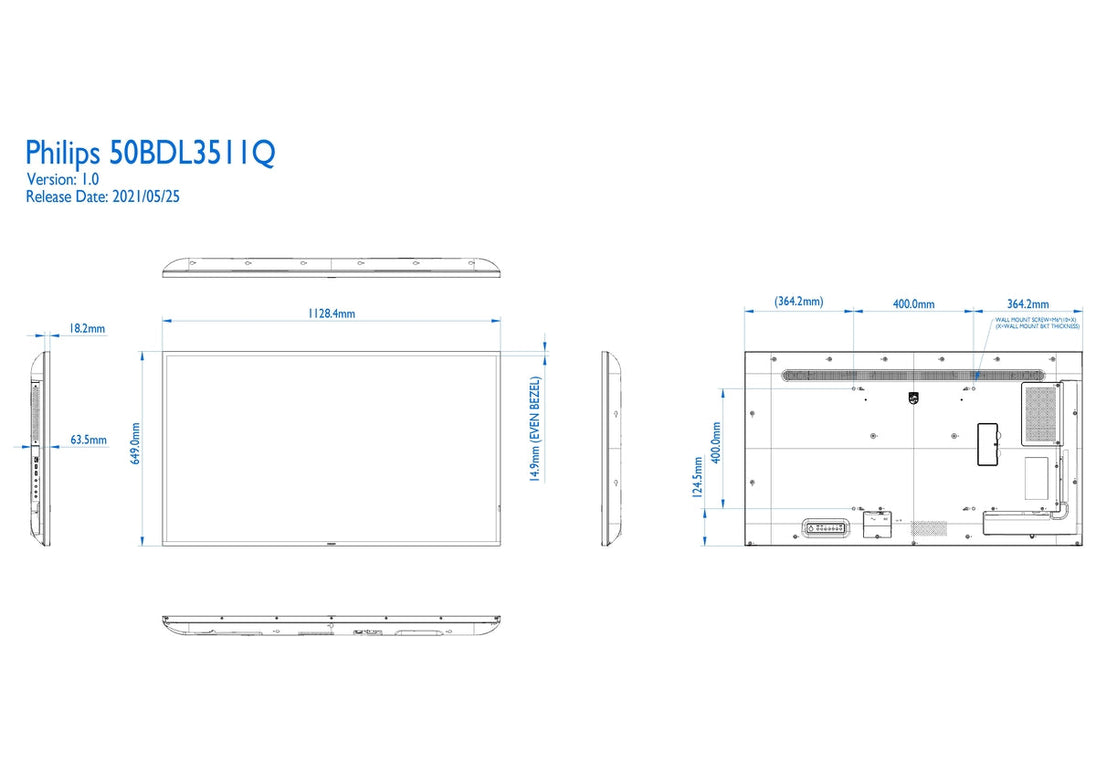 Abmessungen • Abmessungen Gerät (B x H x T): 1128,4 x 649,0 x 63,5 mm • Abmessungen Gerät in Zoll (B x H x T): 44,43 x 25,55 x 2,50 Zoll • Rahmenbreite: 14,9 mm (einheitlicher Rahmen) • VESA-Halterung: 400 x 400 mm, M6 • Produktgewicht: 14,75 kg • Gerätegewicht (lb): 32,52 lb
